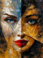Deze afbeelding verbeeldt de dualiteit van de mens door middel van een modern portret dat in twee verschillend gekleurde helften is verdeeld. De koele, rationele kant, vertegenwoordigd door blauw en grijs, contrasteert met de warme, emotionele kant, vertegenwoordigd door goud en bruin, en de opmerkelijke details en contrasten geven de afbeelding een dynamische en moderne sfeer.