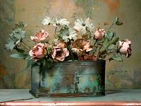 De kleuren zijn overwegend zacht en vergrijsd. Nuances van oudroze, beige, taupe en groengrijs in de bloemen en bladeren. De metalen bak heeft een verweerd uiterlijk met tinten van grijs, blauwgroen en roestbruin.