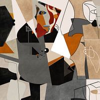 Kubistisch abstract geometrisch werk met warme tinten en ingevoegde minimalistische tekeningen.