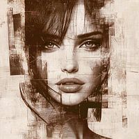 intrigerend portret dat realisme combineert met abstractie. Het gezicht van een vrouw, met een intense en hypnotiserende blik, is centraal gepositioneerd. Haar ogen trekken onmiddellijk de aandacht door hun scherpe detail en emotionele diepte. De lippen, vol en sensueel, voegen een subtiele expressie van mysterie en kracht toe. Het werk speelt met texturen en overlappende lijnen, die een fragmentarisch en gelaagd effect creëren, alsof het gezicht uit verschillende vlakken en dimensies is opgebouwd.
