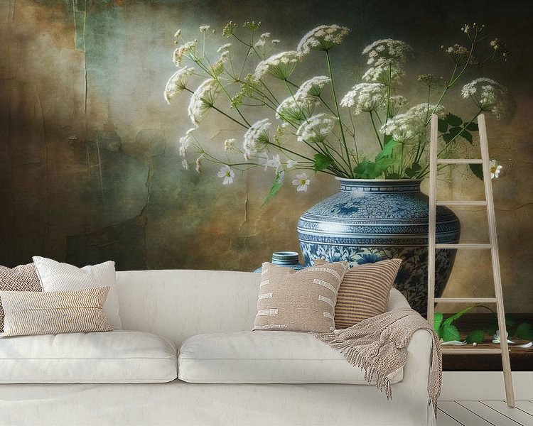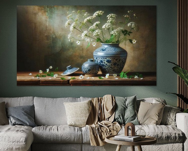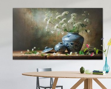 In het kunstwerk zien we een klassieke stilleven met een delfsblauwe kleuren op een porseleinen vaas, prachtige witte bloemen en een rustieke houten tafel.