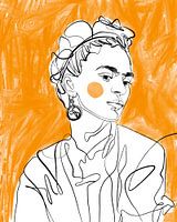 Een minimalistisch lijntekeningportret geïnspireerd door een iconisch Mexicaans artistiek figuur, met expressieve inktcontouren, details van een bloemhoofdstuk en een levendige oranje achtergrond die kracht, cultuur en individualiteit benadrukt.