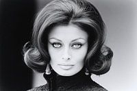 De zwart-wit vintage foto in de stijl van Peter Lindbergh toont een stijlvolle brunette vrouw met een karakteristiek jaren 60 kapsel.