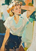 Een portret van een aantrekkelijke vrouw. Ze draagt een witte blouse en een zwarte rok en heeft kort blond haar met franjes. Haar houding is ontspannen, ze leunt met één arm over een tafel. De achtergrond is een abstract kubistisch schilderij met blauwe, groene en oranje tinten, geschilderd met olieverf op canvas.