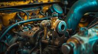 Part of the engine in the centre. The surroundings are characterised by metallic surfaces and mechanical parts in yellowish and blue tones. Focussing on the central element creates an effect of depth and blurs the surrounding parts into a blurred background.