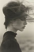 Portret van een vrouw in sepia/zwart wit. Melancholisch geheel. Gesloten ogen, haar haren waaien mee met de wind en haar gedachten. Sober door zwart en ingetogen kleurgebruik. Voile is verweven in haar haar. Passend bij diverse stijlen en trends, waaronder sober en portret. Artist: Bianca ter Riet