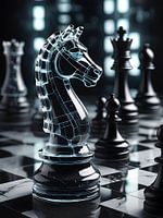 Dit kunstwerk toont een prachtig vormgegeven schaakbord met een opvallend glazen paard als middelpunt. Het paard, weergegeven in gedetailleerd transparant glas, straalt een moderne en futuristische sfeer uit. De achtergrond, donker en vaag verlicht, benadrukt de helderheid en complexiteit van het glazen paard, waardoor het direct in het…