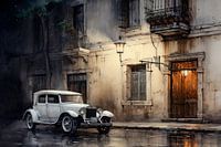 Wie houdt er niet van de eeuwige schoonheid van klassieke oldtimers? Laat je inspireren door de vintage charme van de exclusieve klassieke auto, door de geschiedenis van een vervlogen tijdperk, gevangen in de sfeervolle momenten van een regenachtige dag. De perfecte metgezel voor liefhebbers van klassieke auto's en esthetiek. De afbeelding is gemaakt met ondersteuning van KI en geoptimaliseerd met behulp van beeldbewerkingsprogramma's.