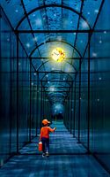 In Tijdreizen zien we een jongetje met een koffertje in de hand en een ballon in de vorm van een klok, verlicht door een halve maan. Hij beweegt zich door een transparante glazen tunnel, bewegend tussen het hier en het daar. Boven hem strekt zich een diepe sterrennacht uit, terwijl aan het einde van de tunnel een mystiek landschap opdoemt – verlicht door één heldere, haast buitenaardse ster.