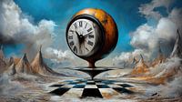 Deze foto toont een zwevende, massieve klok die balanceert op een smalle, bijna fragiele basis, terwijl een uitgestrekt berglandschap zich uitstrekt op de achtergrond. De klok lijkt gewichtloos maar subliem te zweven boven een schaakbordpatroon dat een directe verbinding met de aarde creëert. De dramatische achtergrond van wolken versterkt het gevoel van isolatie en grootsheid, terwijl de scherpe bergtoppen die de lucht doorboren een dreigende aanwezigheid uitstralen.