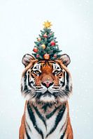 Een majestueuze tijger met een feestelijke kerstboom op zijn hoofd straalt zowel kracht als onverwachte speelsheid uit. De felle kleuren van de kerstballen en de twinkelende ster voegen een humoristisch tintje toe. Dit creatieve kunstwerk is perfect voor in de woonkamer om een warme, uitnodigende sfeer te creëren tijdens de feestdagen.