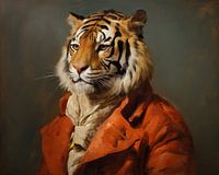 Tijger Portret - Dit intrigerende schilderij toont een tijger met menselijke trekken, gehuld in een oranjerode jas, wat een unieke en enigszins surrealistische uitstraling geeft. De stijl van het werk is klassiek realistisch met een speelse twist, gezien de antropomorfische voorstelling van het dier. De kleuren zijn voornamelijk warme…