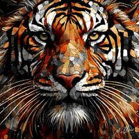 Een afbeelding in mozaïekstijl toont een close-up van het gezicht van een tijger met een felle uitdrukking. De doordringende ogen van het wezen vallen op tegen de kleurrijke vormen waaruit de vacht en gelaatstrekken bestaan.