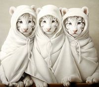 Vintage illustratie met het portret van drie schattige witte tijger welpjes in een poncho.