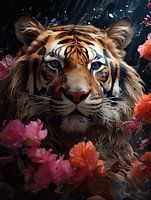 Dit betoverende fine art beeld brengt de kracht en schoonheid van de tijger in een pakkend portret dichtbij, omgeven door een weelde van kleurrijke bloemen. De diepe, zwarte achtergrond creëert een dramatisch contrast waardoor de tijger nog meer opvalt. Dit kunstwerk past perfect in een modern, eclectisch, of boho-chic interieur waar het een indrukwekkende blikvanger en een gespreksonderwerp kan zijn. De combinatie van de majestueuze tijger en de levendige bloemen geeft een unieke artistieke uitstraling aan elke ruimte.