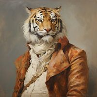 Tijger in Kledij - Dit schilderij toont een majestueuze tijger in historische menselijke kledij, een speels maar klassiek portret dat traditionele portretkunst en dierlijke elegantie samenbrengt. De penseelstreken zijn losjes en impressionistisch, met een beperkt kleurenpalet dat focust op aardetinten, roestbruin en crèmewit, waardoor een warme en tijdloze sfeer ontstaat.