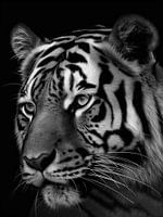 Dit fine art beeld toont de tijdloze gratie van een majestueuze tijger, vastgelegd in een indrukwekkend zwart-wit portret. De tijger straalt kracht, elegantie en sereniteit uit, terwijl de monochrome compositie de aandacht vestigt op de subtiele details en expressie van het dier. Dit kunstwerk vangt de essentie van de tijger op een ingetogen en toch indrukwekkende manier, waardoor een gevoel van bewondering en verwondering ontstaat.