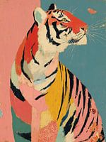 Een levendig abstract schilderij van een tijger, versierd met felle kleuren en bloemmotieven, die vredig naar een vlinder staart, symbool voor kracht, schoonheid en harmonie in de natuur.