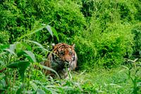 Foto van een tijger tussen gras. De foto geeft een mooi contrast tussen de tijger en het heldere groene gras op de achtergrond.