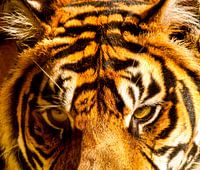 Tijger (Panthera tigris) kijkt met zijn doordringende ogen recht in de camera. De tijger is de grootste nog levende kattensoort met typische donkere verticale strepen op een oranje vacht. Deze specifieke ondersoort is een Sumatraanse tijger die normaal in het wild leeft op het Indonesische eiland Sumatra, maar dit individu verblijft in Burger's Zoo.