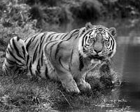 Koop de foto Tijger kijkt recht de lens in na het drinken (zwart wit versie) van Patrick van Bakkum als print op canvas, aluminium dibond, (ingelijste) fotoprint, behang en ArtFrame. Voor jou op maat geprint in Fine-Art kwaliteit.