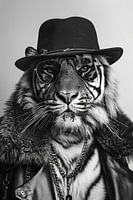 Een portret van een tijger stijlvol gekleed met een slouch hat en een grote zonnebril, in elegant zwart-wit. Modern en artistiek.