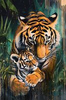 Dit prachtige schilderij toont een moederlijke tijger die haar welp met tedere zorg omarmt. De levendige kleuren en gedetailleerde penseelstreken brengen de kracht en schoonheid van deze majestueuze dieren tot leven. Het contrast tussen de diepe, weelderige junglekleuren en de helderheid van de tijgerstrepen zorgt voor een visueel…