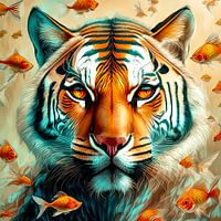 Surrealistische afbeelding van een tijger tussen de goudvissen