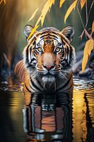 De tijger lijkt even stil te staan, terwijl hij zijn eigen weerspiegeling in het water bewondert. Zijn feloranje vacht en zwart-witte strepen zijn duidelijk te zien, en de diepte van zijn ogen is adembenemend. Het beeld wordt bijna onwerkelijk als je bedenkt dat dit een wilde tijger is, vrij om te zwerven in het bos.