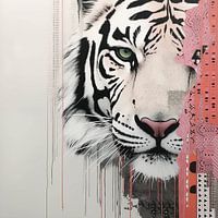 Portret van een witte tijger in een gedetailleerde en realistische stijl, met grafische en abstracte elementen die een eigentijdse draai geven aan het traditionele onderwerp.