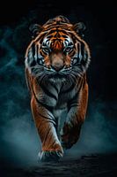 Een majestueuze tijger breekt door de duisternis, met stralende, levendige kleuren en een doordringende blik die de kijker boeit. De dynamische houding en mysterieuze sfeer geven dit kunstwerk een krachtige uitstraling. Ideaal voor een woonkamer waar een gevoel van avontuur en elegantie harmonieus samengaan.