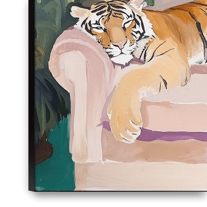 Een tijger ligt te luieren op een bank met planten op de achtergrond. Het schilderij is in lichtroze en lichtpaarse tinten, met heldere kleuren en zachte verlichting. Het close-up perspectief geeft een gevoel van intimiteit en de stijl van het olieverfschilderij met zichtbare penseelstreken creëert een warme, natuurlijke sfeer.