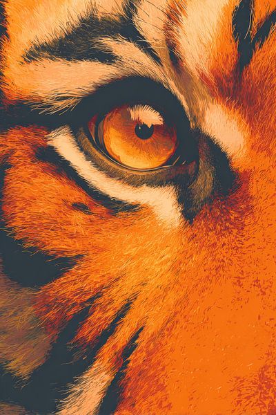 Dit indrukwekkende digitale kunstwerk toont een close-up van het oog van een tijger, badend in vurige tinten van oranje, rood en diep zwart. De fijne lijnen en contrasterende kleuren geven het beeld een intens gevoel van beweging en kracht, alsof de vacht zelf gloeit van energie. Het oog vormt het hypnotiserende middelpunt, met een…