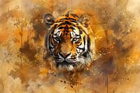 Dit unieke ontwerp toont een indrukwekkend tijgerportret in een abstracte stijl. De krachtige en majestueuze blik van de tijger wordt versterkt door de dynamische en kleurrijke achtergrond. Dit kunstwerk combineert realisme en abstractie, waardoor het een opvallend stuk is dat elke ruimte kan verrijken. Perfect voor liefhebbers van moderne kunst en dierenportretten, zal dit schilderij zeker de aandacht trekken en een gespreksonderwerp vormen. Hang het in uw woonkamer, eetkamer of kantoor om een vleugje wilde schoonheid en artistieke flair toe te voegen. De warme tinten en expressieve penseelstreken maken dit schilderij tot een veelzijdig en visueel aantrekkelijk stuk.