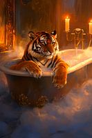 Een majestueuze tijger geniet van een ontspannend bubbelbad in een weelderig bad, omringd door zacht kaarslicht. Het contrast tussen de woeste elegantie van de tijger en de rustgevende sfeer zorgt voor een betoverend schouwspel. Stoom omhult de scène, terwijl de gouden accenten van de kamer een vleugje luxe toevoegen. Een magisch moment…