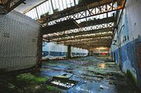 Aabe wollen deken fabriek in Tilburg. Een stuk Nederlandse geschiedenis aan jouw muur. Hal met glazen dak en constructie die weerspiegeld op de grond in een plas met water. Ook als zwart-wit leverbaar in mijn shop.