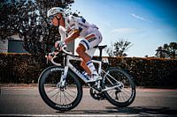 Tim Merlier wist maar liefst 16 keer te winnen in 2025 als Europees kampioen op de weg. Daarom dit prachtige werk van Tim Merlier met witte koersbroek en aangepaste fiets. De Belgische driekleur op zijn mouwen als teken dat hij ook op de weg ooit al de titel en trui droeg. Haal Tim nu in huis.