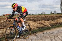 Prachtige en unieke foto van Tim Merlier die op weg is naar de winst in Nokere koerse. Voor het tweede jaar op rij kan hij deze koers in zijn achtertuin winnen en voor het eerst doet een renner dit in de nationale kampioenen trui van België. Haal deze prachtige actiefoto in huis.
