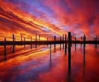 Reflectie van een intense zonsondergang op het Veerse Meer in Zeeland met paarse en diep rode kleuren
