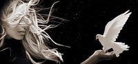 Tijd voor vrede; Fotokunst in zwart en licht sepia tint met een witte duif die landt op de hand van een vrouw. Conceptuele kunst, emotie.