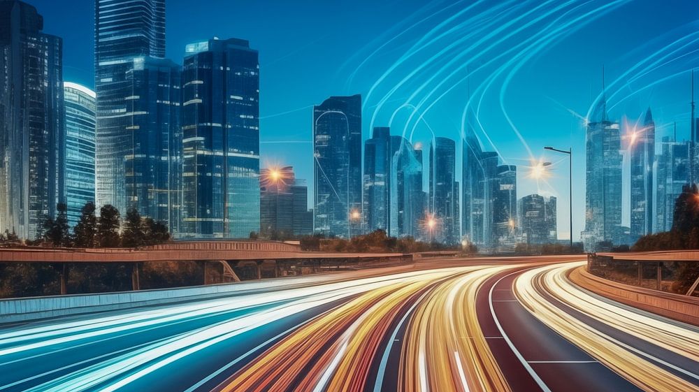 Time-lapse autolichtsporen op de stadsstraat bij nacht met skyline op de achtergrond