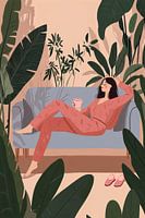 De illustratie toont een jonge vrouw die ontspannen op een bank ligt in een omgeving vol tropische planten. Met een kop thee in haar hand geniet ze van een rustig moment in de natuur, wat een gevoel van vrede en rust uitstraalt.