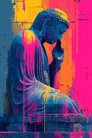 Een gestileerde afbeelding van een zittend Boeddhabeeld in een meditatieve houding, het beeld is afgebeeld met levendige kleuren. De achtergrond bestaat uit een abstracte mix van kleuren en texturen, die de serene uitdrukking van het beeld en de details van het gewaad versterken.