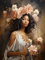 Ervaar de betovering van een Afrikaanse vrouw, omringd door zachtroze bloemen en een dromerige beige achtergrond. Een moment van tijdloze schoonheid en serene harmonie.