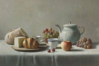 Details: brood, kaas, druiven, appel, theepot, kopje, stilleven, ontbijt, tafel, realisme