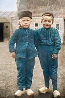A rare hand-colored photograph from the early 19th century, scanned from an original glass negative in my possession. Two young rural boys stand side by side on a traditional Dutch farmyard, their wooden clogs firmly planted on the pavement. One boy has his arm draped affectionately over the other’s shoulder, both smiling warmly into the camera. The rustic backdrop of the farmhouse adds to the authenticity of the scene, while their joyful expressions transcend time.