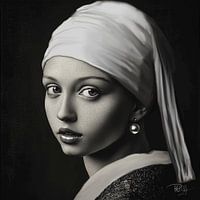 Dit digitale kunstwerk van René v.d. Berg herinterpreteert Vermeers "Meisje met de Parel" in een tijdloos monochroom palet. De subtiele craquelé-textuur geeft het beeld een klassieke uitstraling, terwijl de zachte lichtval en diepe schaduwen de blik van het meisje mysterieus en intens maken. De compositie ademt een melancholische…