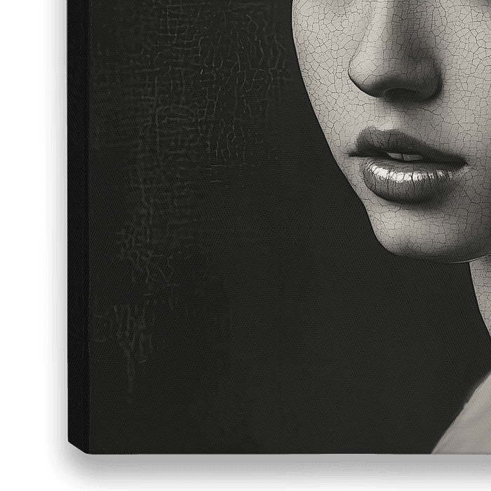 Dit digitale kunstwerk van René v.d. Berg herinterpreteert Vermeers "Meisje met de Parel" in een tijdloos monochroom palet. De subtiele craquelé-textuur geeft het beeld een klassieke uitstraling, terwijl de zachte lichtval en diepe schaduwen de blik van het meisje mysterieus en intens maken. De compositie ademt een melancholische…