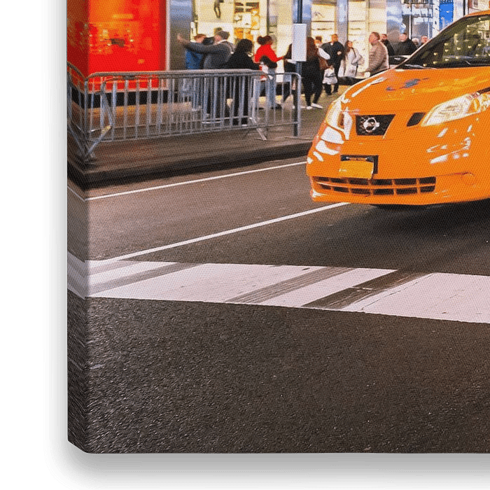Zicht op Times Square in New York City bij avond. Op de voorgrond staan twee gele taxi's te wachten voor een stoplicht op 7th Avenue.