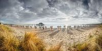 Strand met strandstoelen, pier en Mikado-theehuis. De Oostzee bij Timmendorfer Strand aan de Lübeckbaai in Sleeswijk-Holstein.